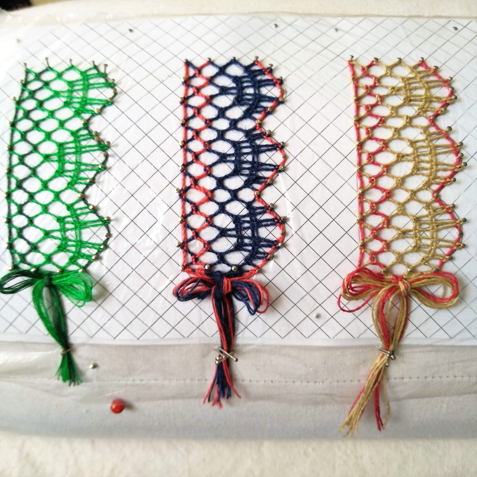 Pre porovnanie som rovnaký kúsok paličkovala aj z obuvníckej nite. Vlákna sú tvrdšie a uzly počas špendlenia k sebe pekne sadajú, ale po vytiahnutí špendlíkov to nie je také pevné ako pri ľanovej niti.