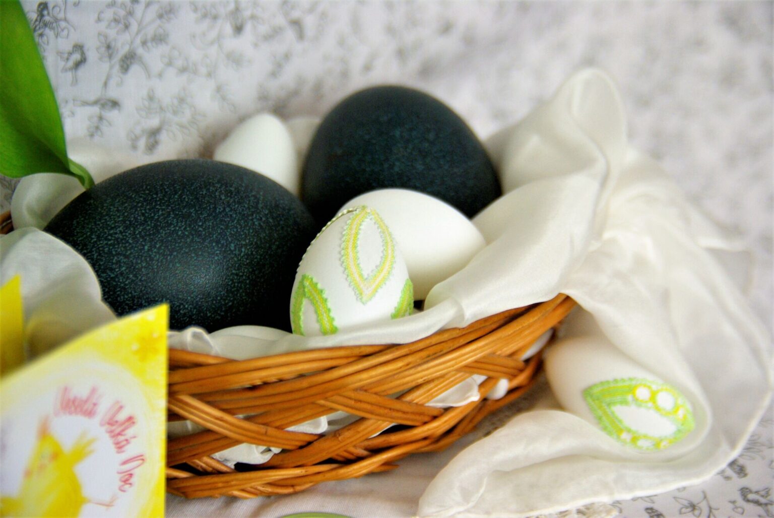 Vajíčka majú rôzne veľkosti – slepačie, husiacie, pštrosie 🙂 Tie veľké zelené v košíku sú pštrosie. Tak sa trochu povenujeme aj tomu, ako vzor upraviť – aby sa dal použiť na rôzne veľkosti.